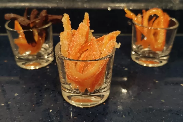 Una vez enfríen ya están listas para consumir en su propio almíbar. A mí me encantan los melocotones en almíbar y esta receta de cáscaras de naranja confitada está también deliciosa.Método de presentación 2: bañadas en azúcar