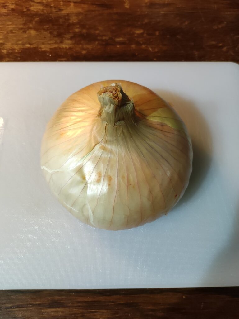 Lo primero es pelar la cebolla dulce, el ingrediente principal de esta receta. Le quitamos las primeras capas hasta que la veamos blanca. Luego quitamos la parte de arriba que es el tallo y la parte de abajo que es la raíz.